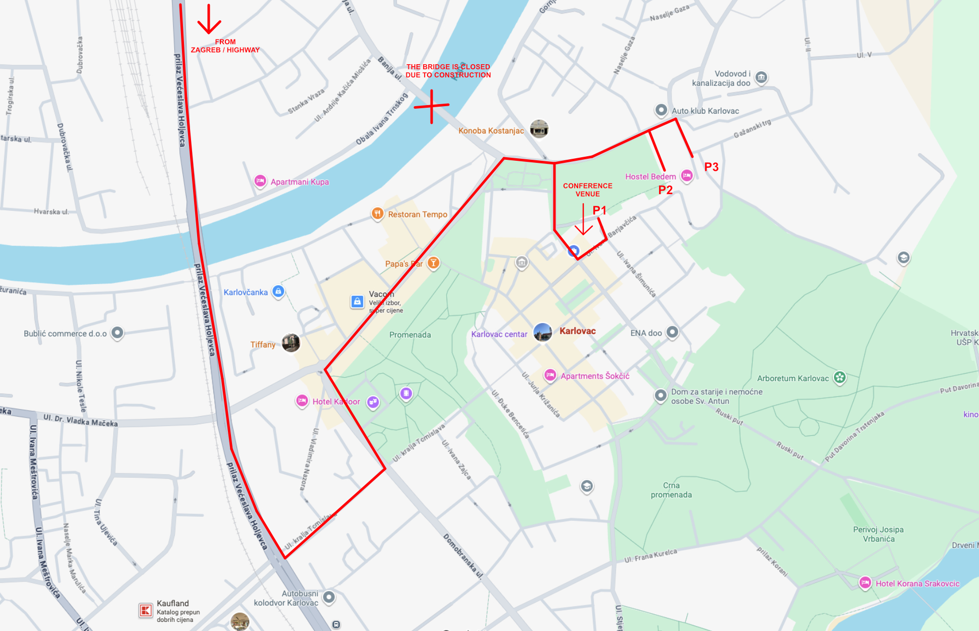 Due to long-term road works in the center of Karlovac, free parking is only possible in a few places. The Banija bridge is currently also closed due to renovation, so arriving at the Karlovac University of Applied Sciences from the direction of Zagreb or the highway is only possible via the ring road (Prilaz Večeslav Holjevac) and Korzo (Ivana Gundulić Street).