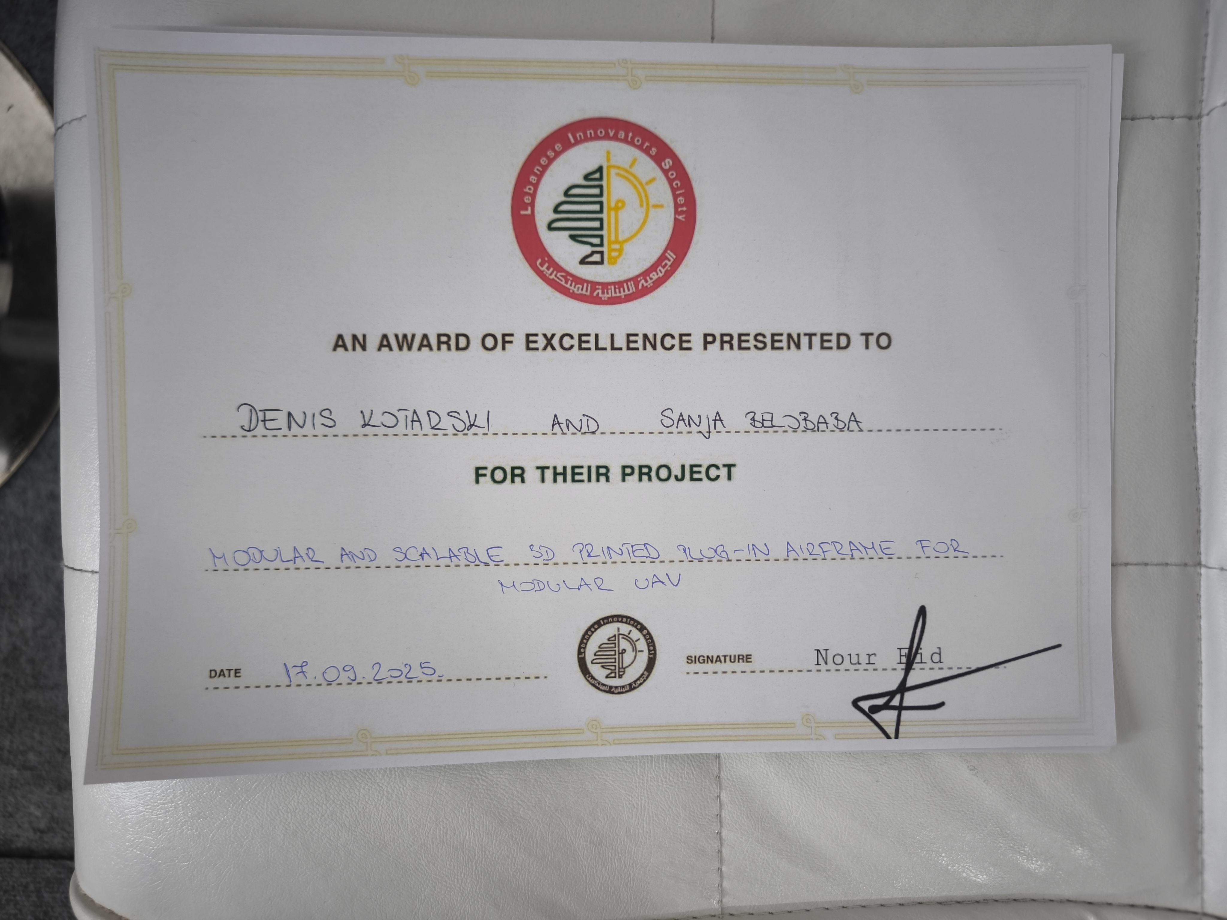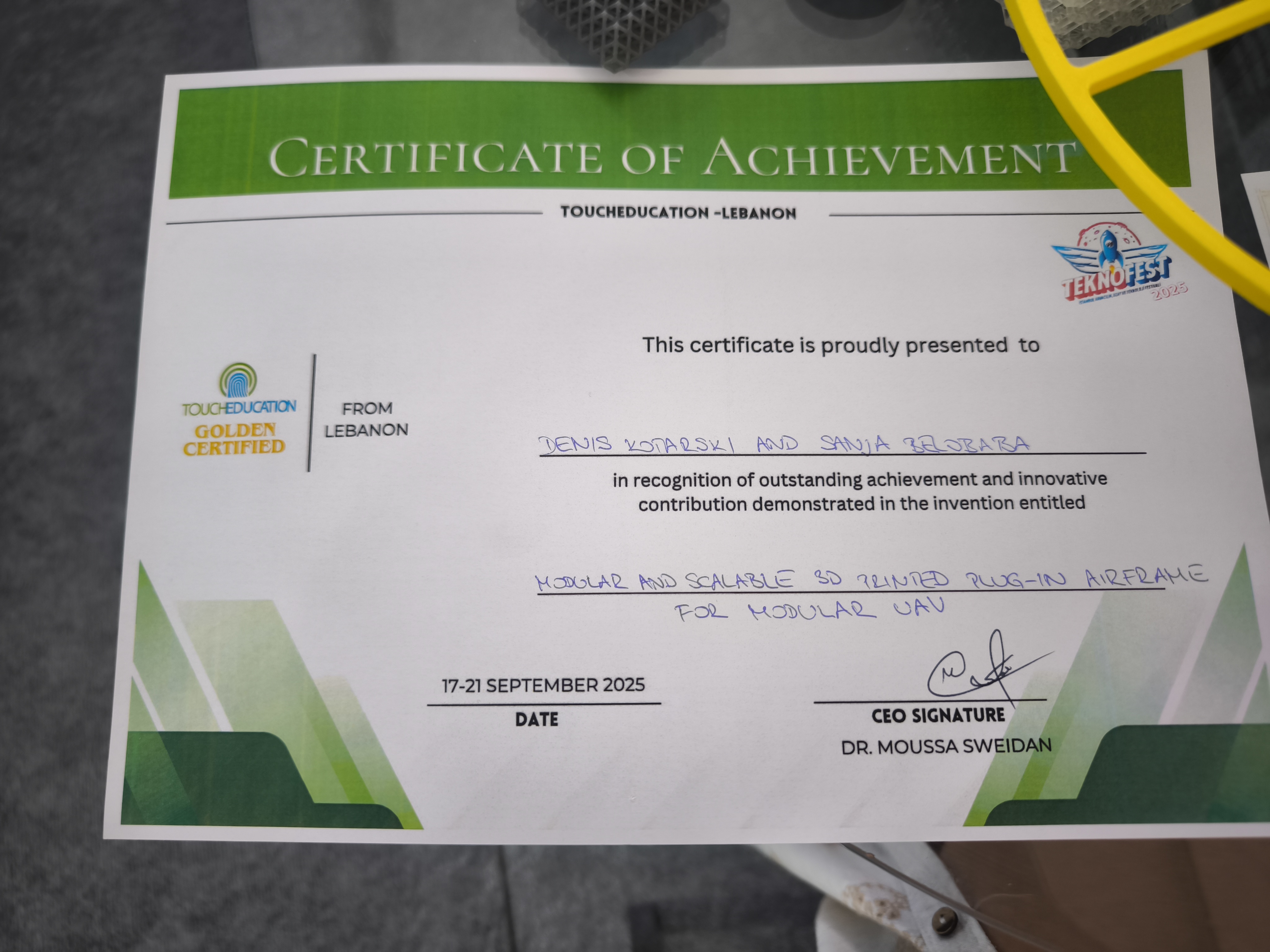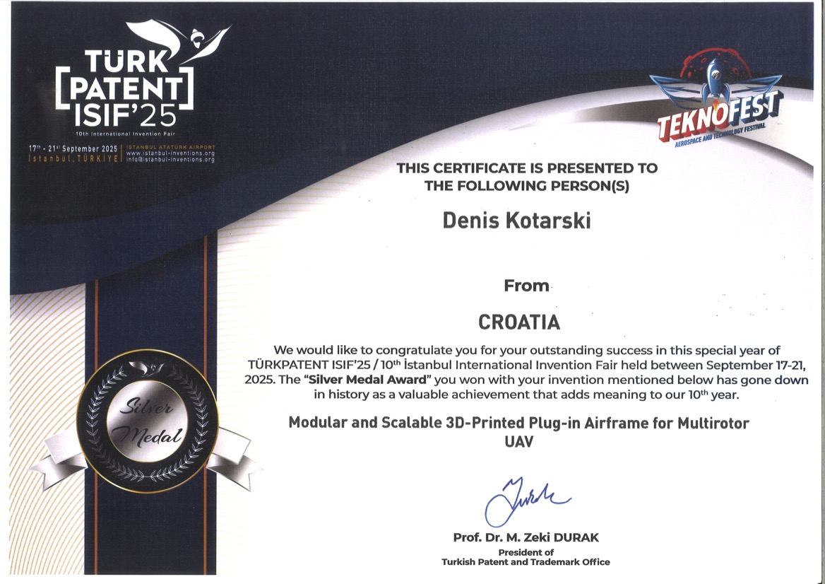 Članovi projekta predstavili su modularnu i skalabilnu 3D printanu konstrukcija multirotorne letjelice s plug-in dizajnom koja omogućuje brzo sklapanje i rasklapanje te integrirane vodilice za jednostavnu izmjenu baterije i povezivanje s baznim stanicama, povećavajući fleksibilnost i operativnu učinkovitost, te osvojili srebrnu medalju.