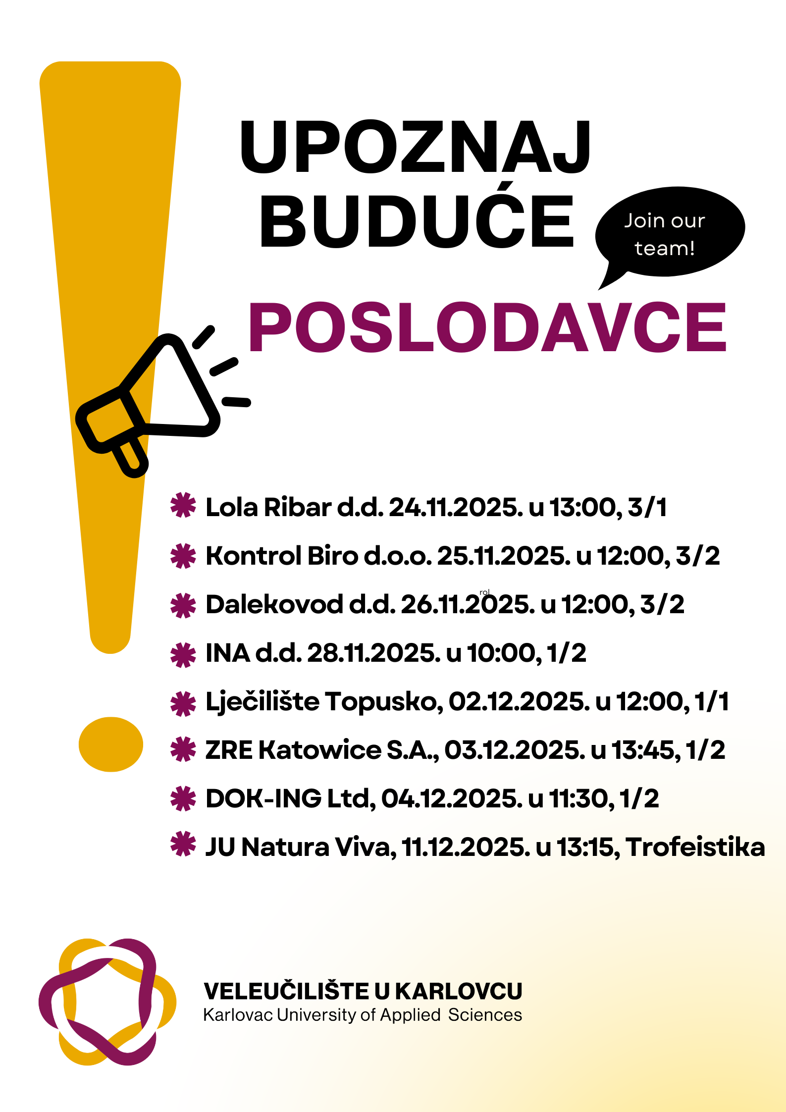 Na Veleučilištu u Karlovcu započinju još jedni Dani poslodavaca! Tijekom događanja studentima će se predstaviti niz poslodavaca koji će im prezentirati više o mogućnostima zapošljavanja i rada u njihovim tvrtkama i organizacijama. Saznajte kako izgleda prijava za posao, što obuhvaćaju selekcijski postupci, koje su najtraženije kompetencije te koje mogućnosti napredovanja, profesionalnog razvoja i beneficije poslodavci nude.