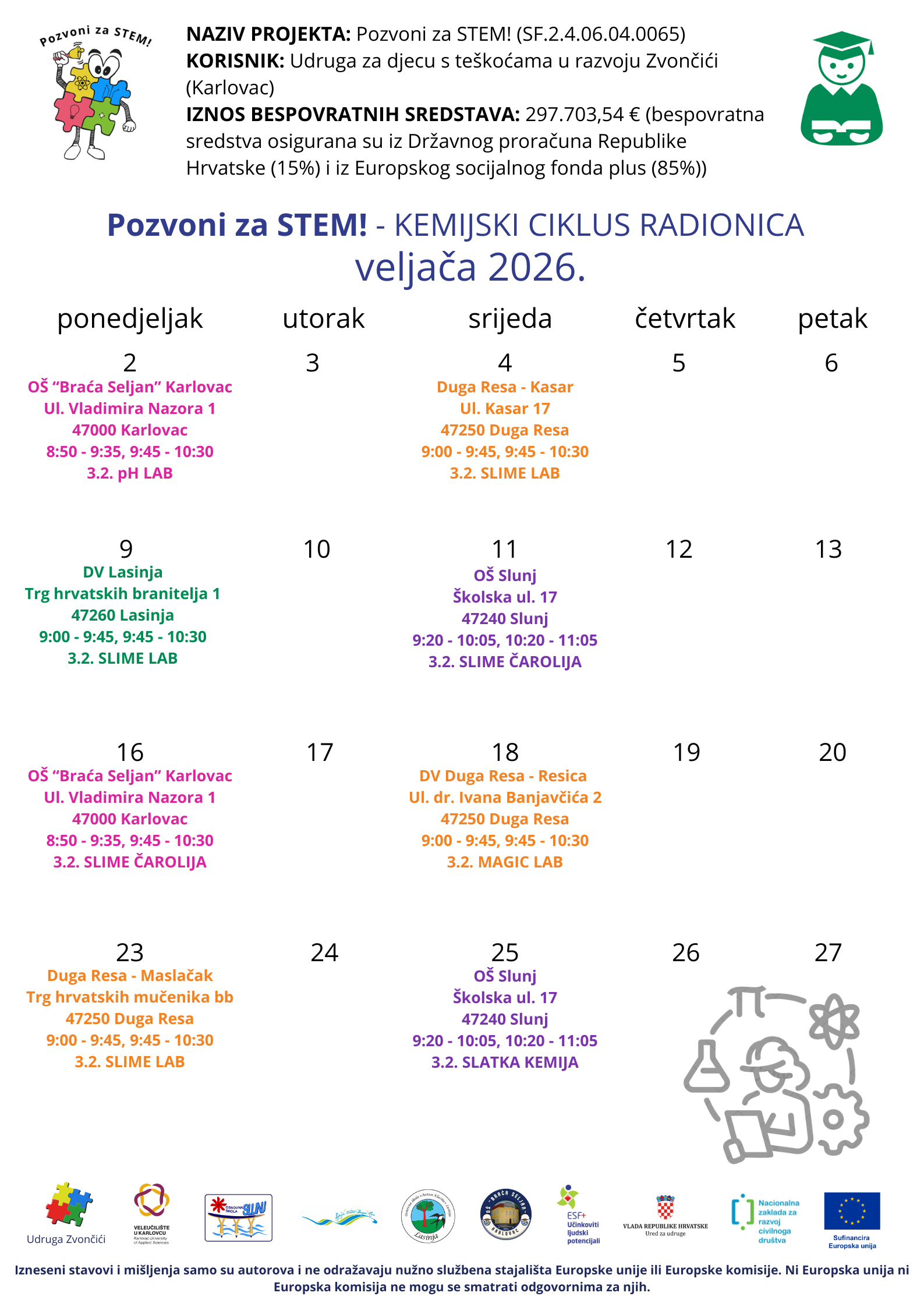 Udruga za djecu s teškoćama u razvoju Zvončići najavljuje nastavak edukativnih i interaktivnih radionica za djecu osnovnoškolske i vrtićke dobi u STEM području, a koje se provode u sklopu projekta sufinanciranog sredstvima Europske Unije naziva „𝐏𝐨𝐳𝐯𝐨𝐧𝐢 𝐳𝐚 𝐒𝐓𝐄𝐌!“ SF.2.4.06.04.0065 u iznosu od 𝟐𝟗𝟕.𝟕𝟎𝟑,𝟓𝟒 €.