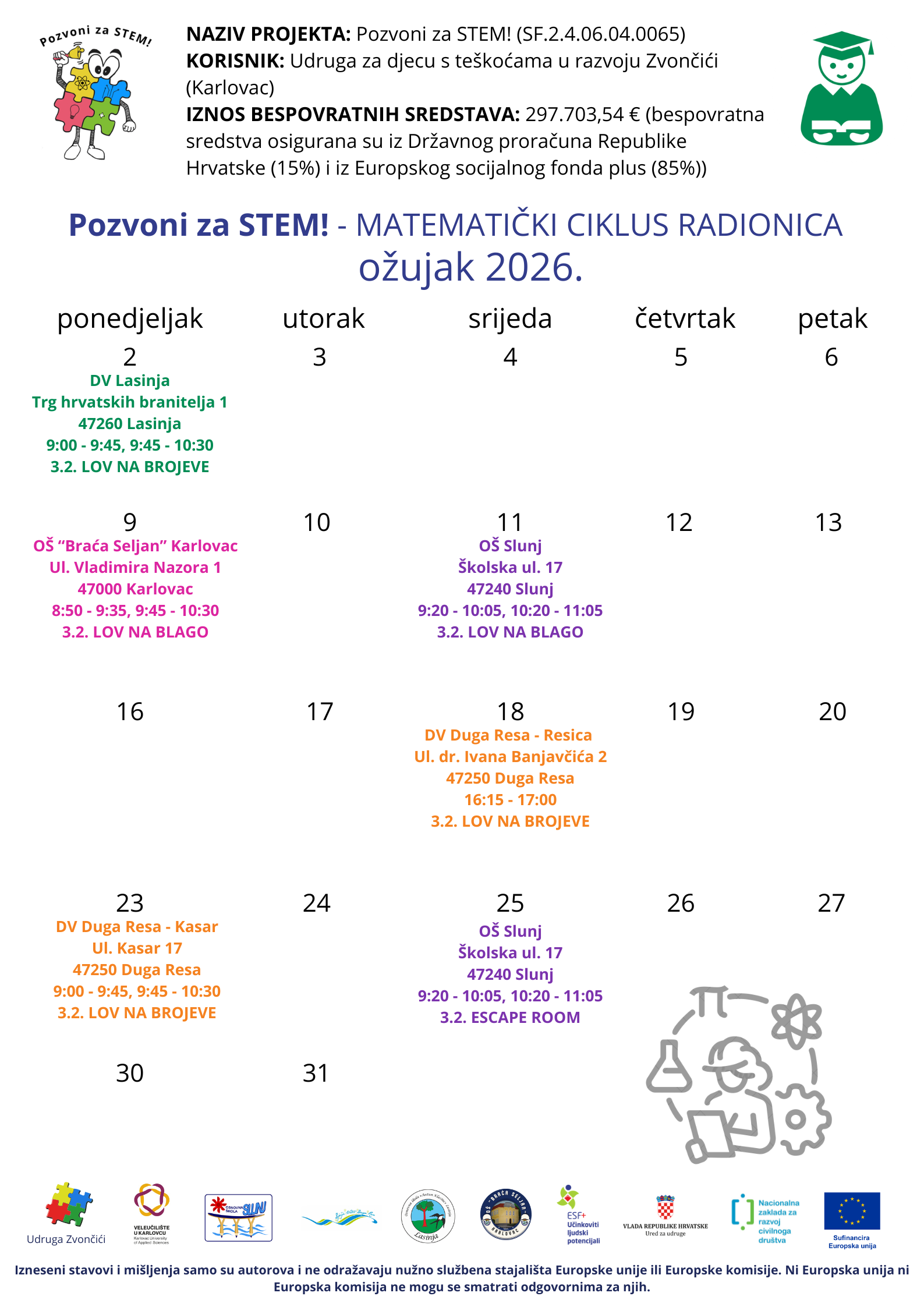 Udruga za djecu s teškoćama u razvoju Zvončići najavljuje nastavak edukativnih i interaktivnih radionica za djecu osnovnoškolske i vrtićke dobi u STEM području, a koje se provode u sklopu projekta sufinanciranog sredstvima Europske Unije naziva „𝐏𝐨𝐳𝐯𝐨𝐧𝐢 𝐳𝐚 𝐒𝐓𝐄𝐌!“ SF.2.4.06.04.0065 u iznosu od 𝟐𝟗𝟕.𝟕𝟎𝟑,𝟓𝟒 €.