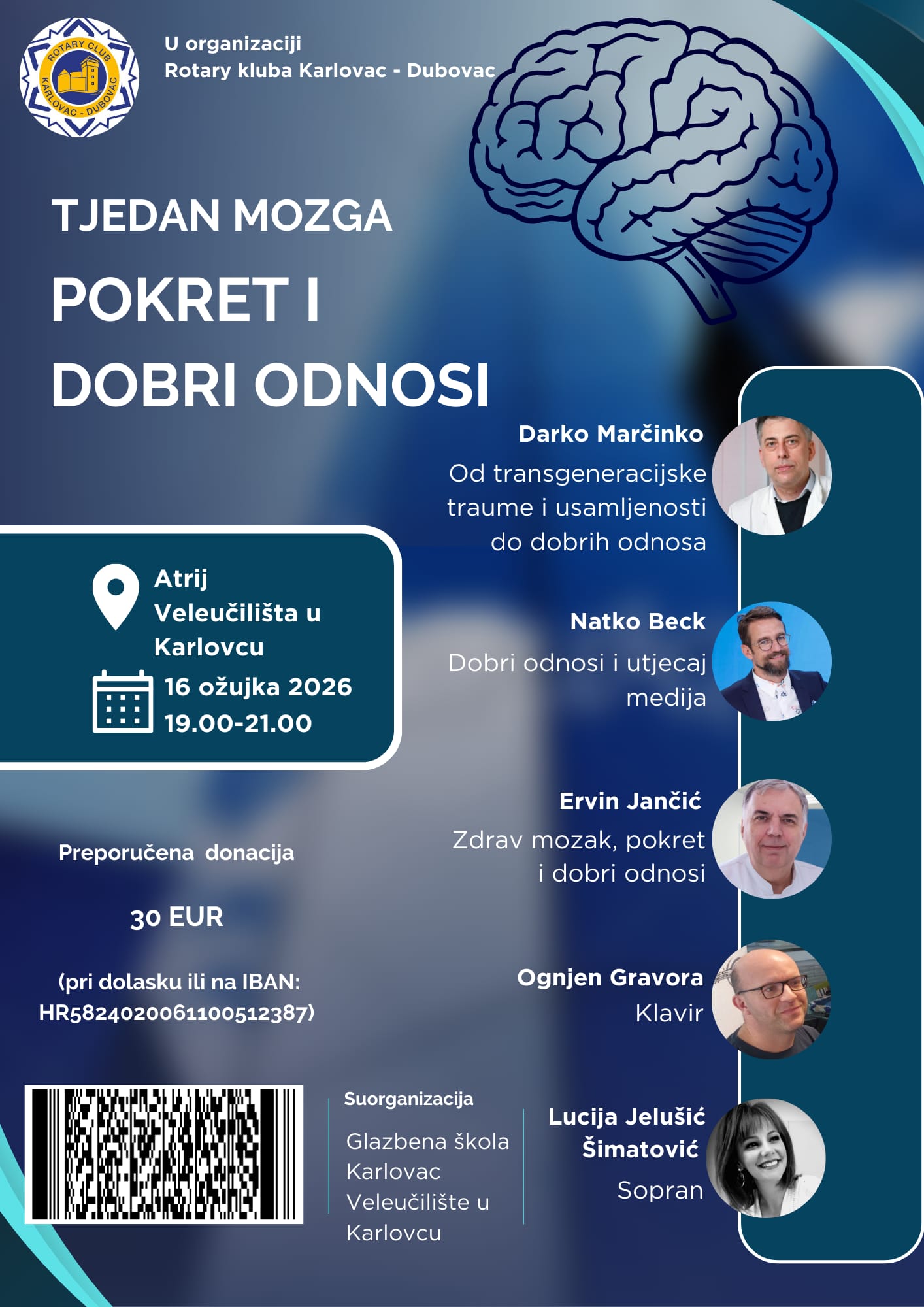 U ponedjeljak, 16. ožujka 2026. od 19:00 do 21:00 u Atriju Veleučilišta u Karlovcu u organizaciji Rotary kluba Karlovac - Dubovac održat će se predavanja posvećena temi zdravlja mozga, važnosti kretanja i kvalitetnih međuljudskih odnosa.