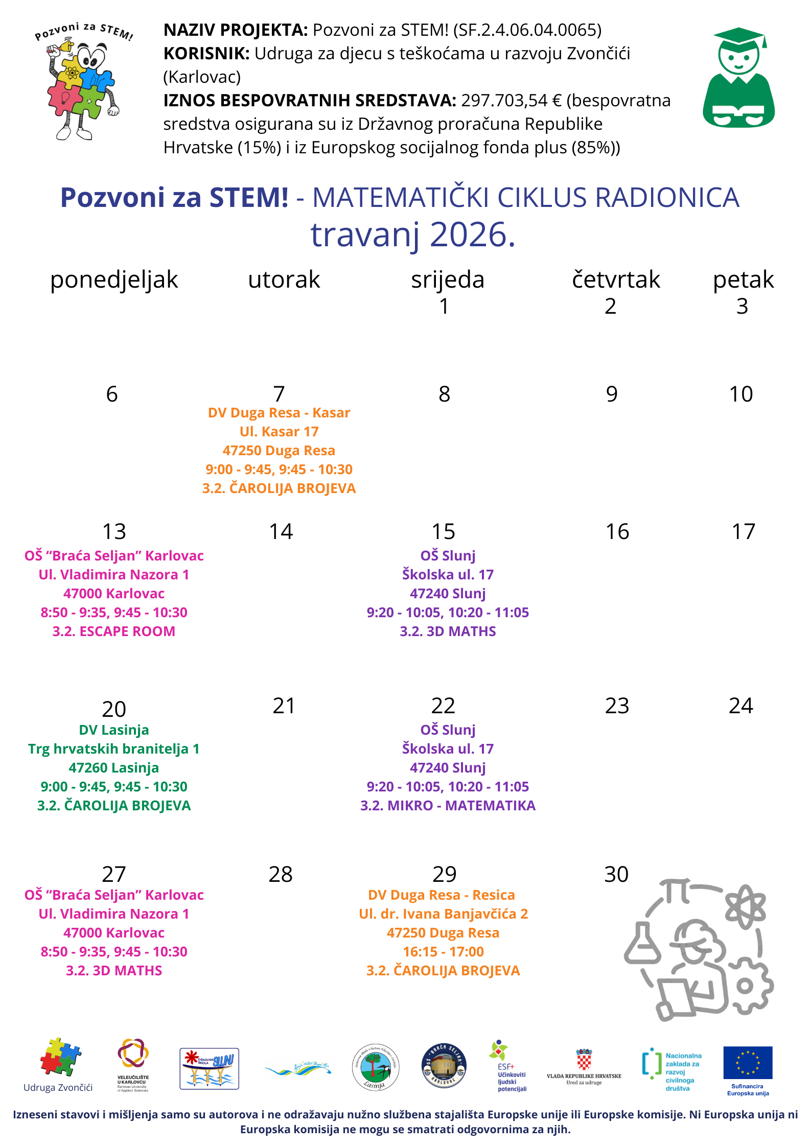 Projekt je financiran od Europske unije iz Europskog socijalnog fonda plus (85%) i sufinanciran iz Državnog proračuna Republike Hrvatske. Projekt se provodi u partnerstvu s Veleučilištem u Karlovcu, Osnovnom školom Slunj, Osnovnom školom „Antun Klasinc“ Lasinja, Osnovnom školom „Braća Seljan“ iz Karlovca te Dječjim vrtićem Duga Resa.