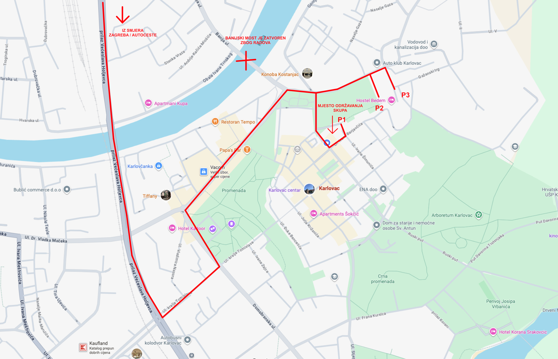 Na karti niže su prikazana parkirališta na kojima možete besplatno parkirati svoje vozilo. Da bi došli na navedena parkirališta, slijedite crvene linije. Imajte na umu da je moguće da će na dan održavanja skupa neke od prilaznih cesta do Veleučilišta zbog radova biti zatvorene.