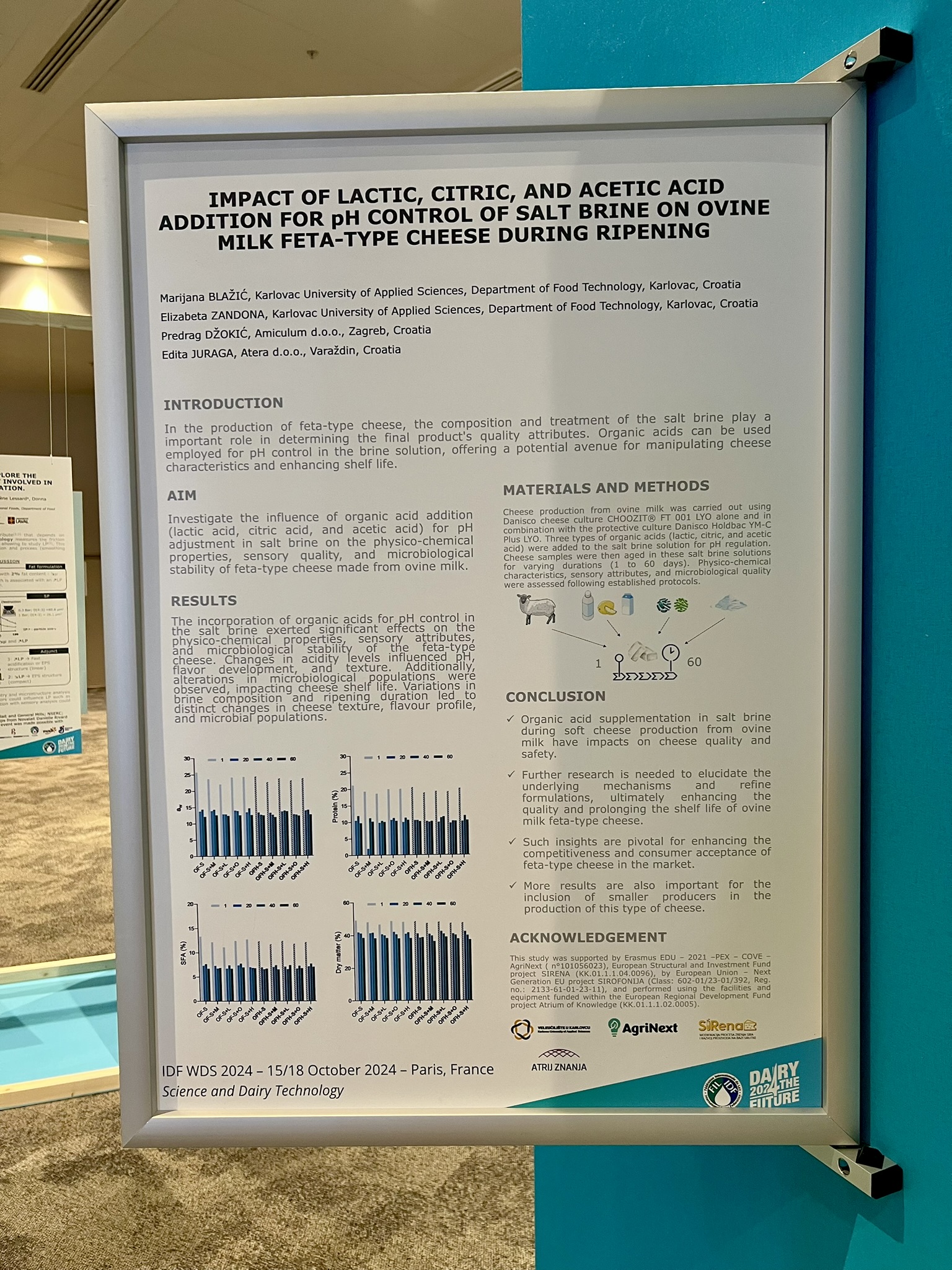 U posterskoj sekciji skupa članice tima predstavile su rad pod naslovom "Impact of Lactic, Citric, and Acetic Acid Addition for pH Control of Salt Brine on Ovine Milk Feta-Type Cheese during Ripening", koji istražuje utjecaj dodatka mliječne, limunske i octene kiseline za kontrolu pH salamure tijekom procesa dozrijevanja ovčjeg feta sira. Dobiveni rezultati pružaju nova saznanja o optimizaciji tehnoloških postupaka u proizvodnji sireva te mogu doprinijeti razvoju proizvoda poboljšane kvalitete i stabilnosti.
